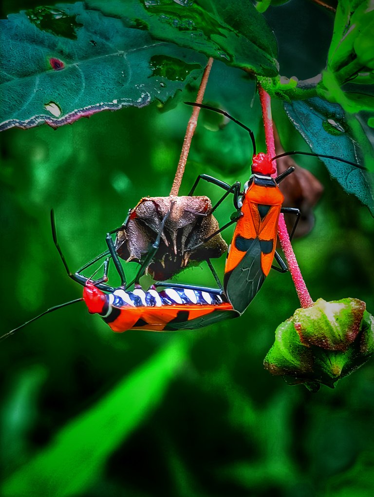 First: Assassin Beetles (Oncopeltus sp.) or Assassin bugs, named assassin beetles because their backs resemble assassin masks. Their wings and head are predominantly bright orange and black, while their undersides are black and white.