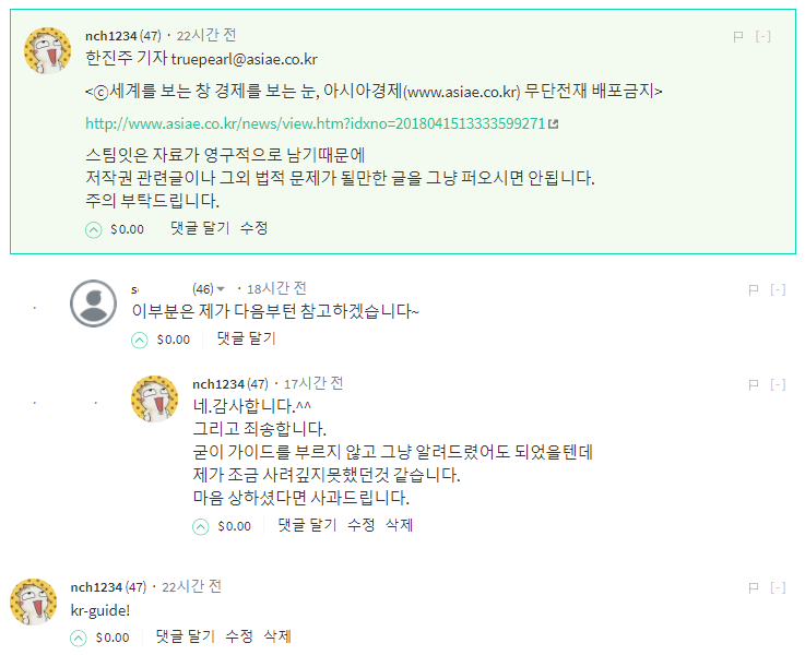 어제 저작권이 문제 되는 기사 전문을 올리는 유저분에게